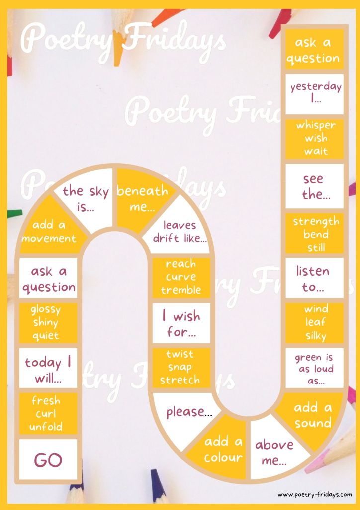 Each space contains a prompt. Use that prompt to write a line of poetry. If you land on a space with 3 words, include at least one of those words in your line.